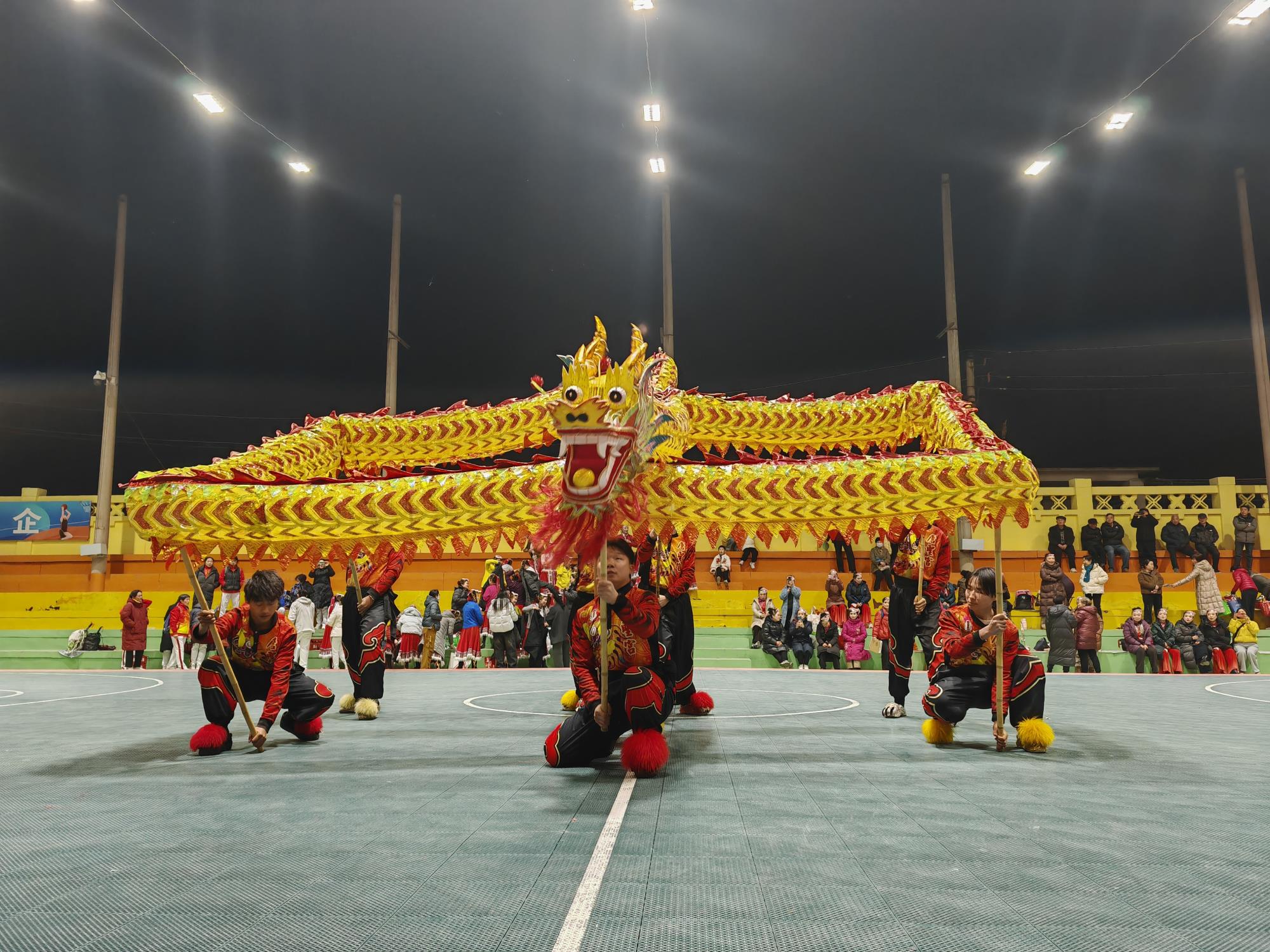 晚上7点,宝钛老区灯光球场华灯璀璨、人潮涌动,元宵游园活动在喜庆欢快的舞蹈《开门红》中正式拉开帷幕。气势磅礴的《彩龙舞东方》惊艳登场,飞天龙灯在夜空中盘旋升腾,瞬间点燃全场热情;刚柔并济的《太极表演》行云流水,尽显宝钛人干事创业张弛有度、步履铿锵的精神风貌;舞蹈《盛世欢歌》《舞动钛城》节奏明快、活力四射,生动展现钛城儿女昂扬向上、奋发有为的时代风采;紧接着登场的舞龙表演腾跃穿梭、气势如虹,将现场氛围一次次推向高潮;古韵十足的《大唐百戏》妙趣横生,带领观众沉浸式穿越市井繁华;两只醒狮腾挪跳跃、威武灵动,与现场观众热情互动、纳祥送福,最终狮口吐幅——“恭喜发财 万事腾意”的美好祝福引发全场阵阵欢呼。