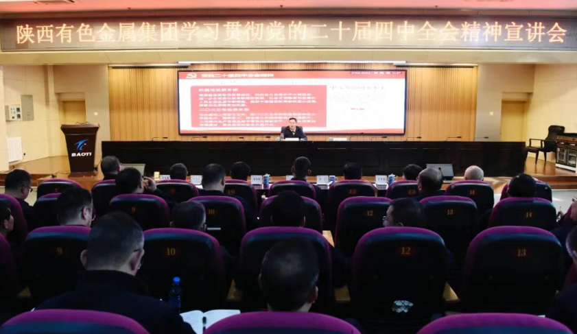 11月25日,陕西有色金属集团党委副书记、董事、总经理莫勇到宝钛集团宣讲党的二十届四中全会精神并调研。宝钛集团党委书记、董事长王俭主持宣讲会并陪同调研。