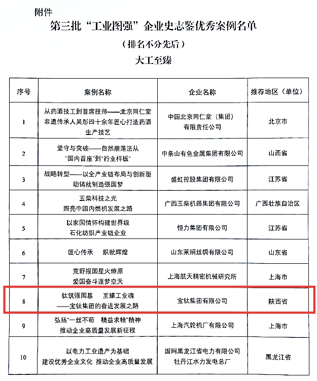 近日,宝钛集团成功入选工信部工业文化发展中心第三批“工业图强”企业史志鉴优秀案例名单。