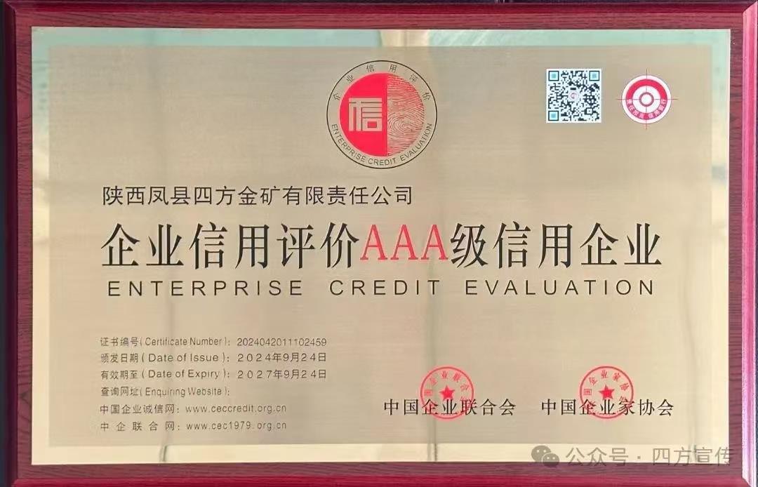 四方金矿始终秉持诚信经营、合规发展理念,严格遵循行业信用规范,系统构建法律风控体系,全面履行国企社会责任,社会影响力和品牌美誉度不断提升。继2024年获得中国企业联合会、中国企业家协会颁发的AAA级企业信用等级证书后,此次再获有色金属行业企业最高信用等级评价,为公司健康可持续发展提供了有力支撑。