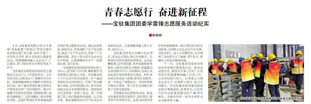 3月,宝钛集团有限公司(以下简称“宝钛集团”)团委以“青春志愿行 奋进新征程”为主题,组织开展了一系列形式多样、贴合实际的志愿服务活动,将雷锋精神融入企业生产、厂区建设、职工服务和乡村帮扶等各个环节。