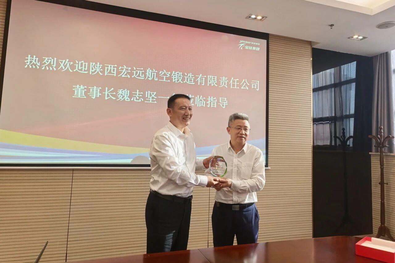 4月17日,中国航空工业集团陕西宏远航空锻造有限责任公司(以下简称航空工业宏远)党委书记、董事长魏志坚一行来宝钛走访交流,并为宝钛股份颁发2025年度“金牌供应商”奖牌。宝钛集团党委书记、董事长,宝钛股份董事长王俭出席座谈会并接受授牌。