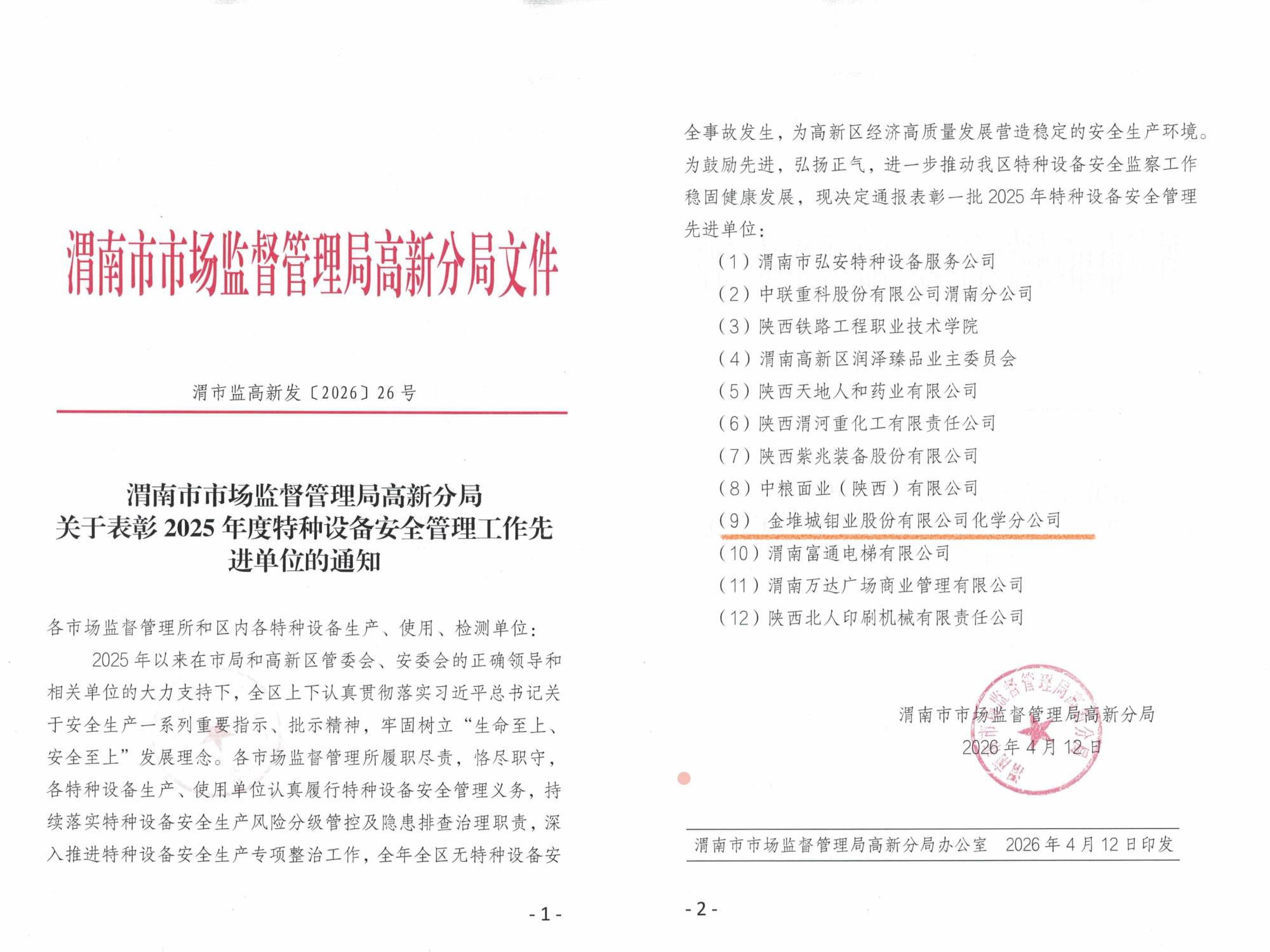 近日,渭南市高新区市场监督管理局发布表彰通报,金钼股份化学分公司凭借严谨规范的特种设备安全管理体系、扎实有力的风险防控举措,荣获2025年度渭南市高新区特种设备安全管理先进单位称号。