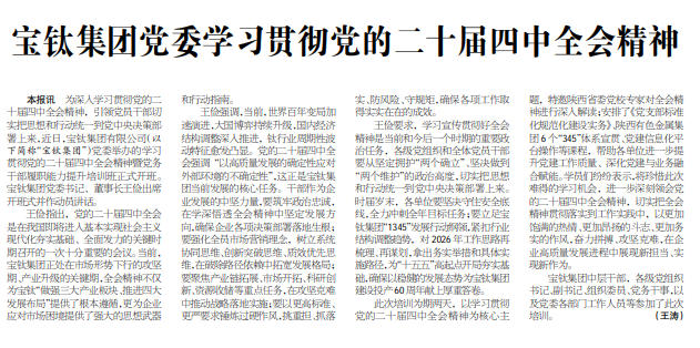 王俭要求,学习宣传贯彻好全会精神是当前和今后一个时期的重要政治任务,各级党组织和全体党员干部要从坚定拥护“两个确立”、坚决做到“两个维护”的政治高度,切实把思想和行动统一到党中央决策部署上来。时届岁末,各单位要坚决守住安全底线,全力冲刺全年目标任务;要立足宝钛集团“1345”发展行动纲领,紧扣行业结构调整趋势,对2026年工作思路再梳理、再谋划,拿出务实举措和具体实施路径,为“十五五”高起点开局夯实基础,确保以稳健的发展态势为宝钛集团建设投产60周年献上厚重答卷。