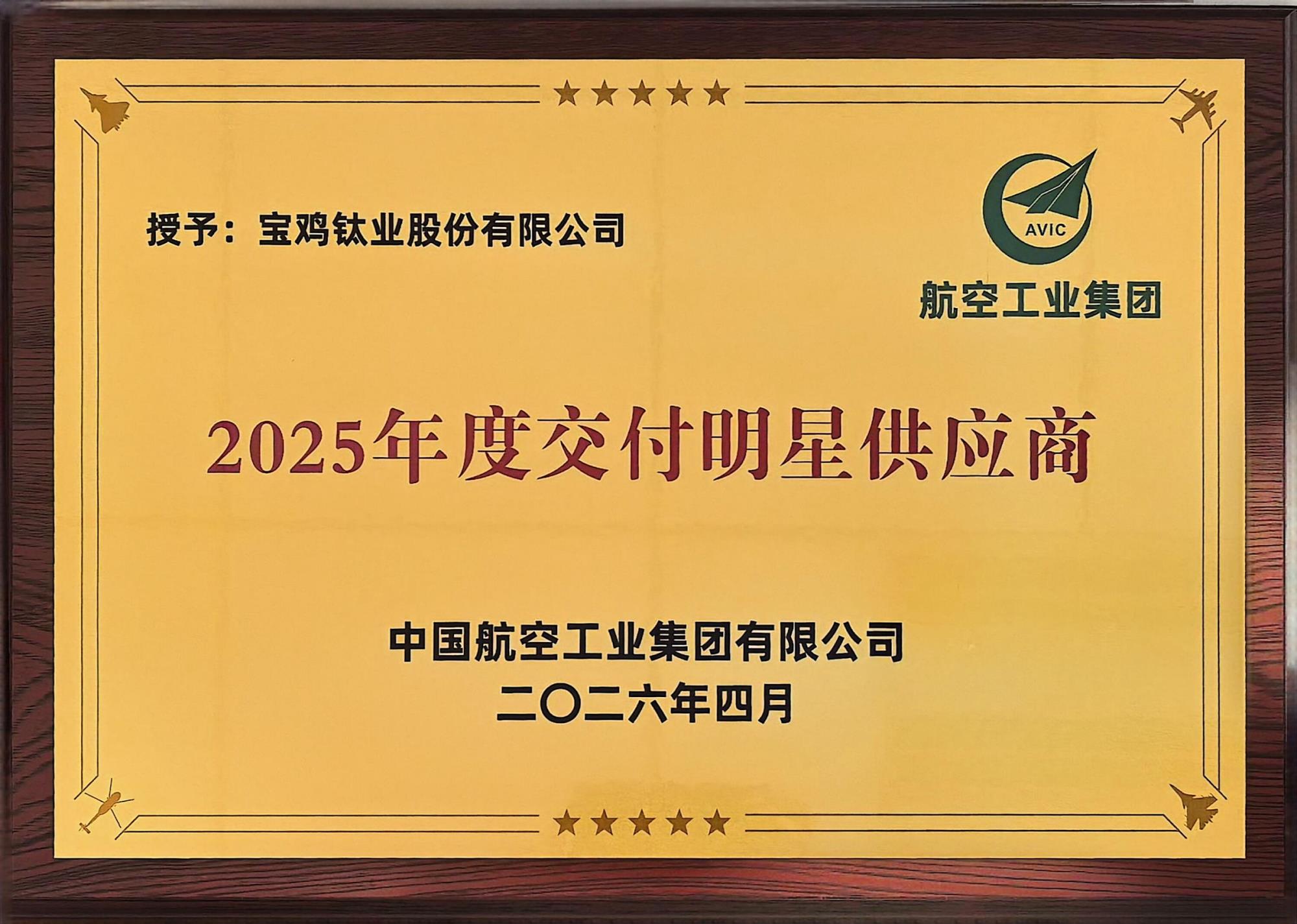近日,中国航空工业集团有限公司(以下简称“航空工业集团”)2026年供应商大会召开。宝鸡钛业股份有限公司(以下简称“宝钛股份”)凭借在交付保障、品质管控、协同响应等方面的优异表现,获得“2025年度交付明星供应商”称号。宝钛集团有限公司副总经理何书林出席大会并现场领取奖牌。