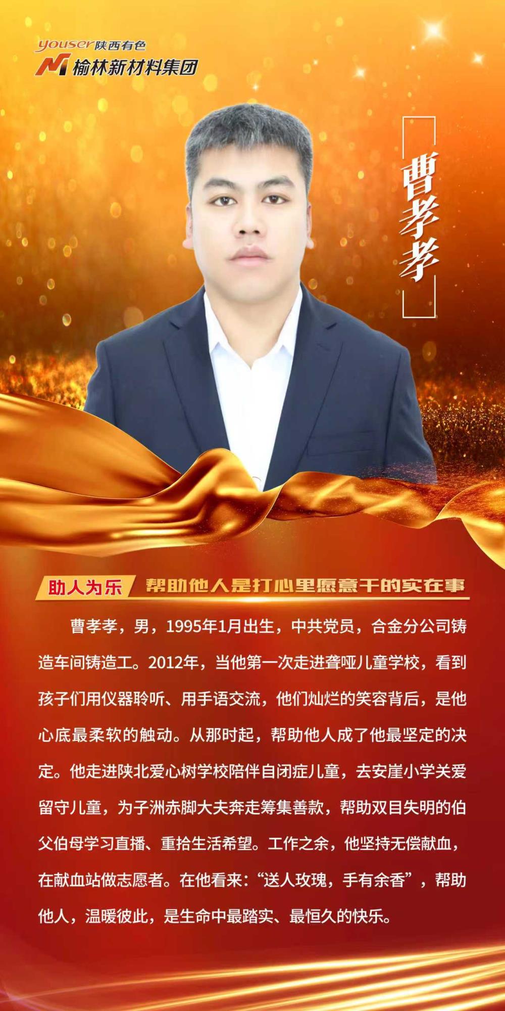 发布仪式上,榆林新材料集团合金分公司铸造车间铸造工曹孝孝被授予“助人为乐好人”;铝业分公司净化供料车间检修电工吴俊龙被授予“敬业奉献好人”;铝业分公司电解三车间多功能天车工雍乐被授予“孝老爱亲好人”;铝业分公司供电车间高压运行工段秀丽被授予“自强励志好人”。